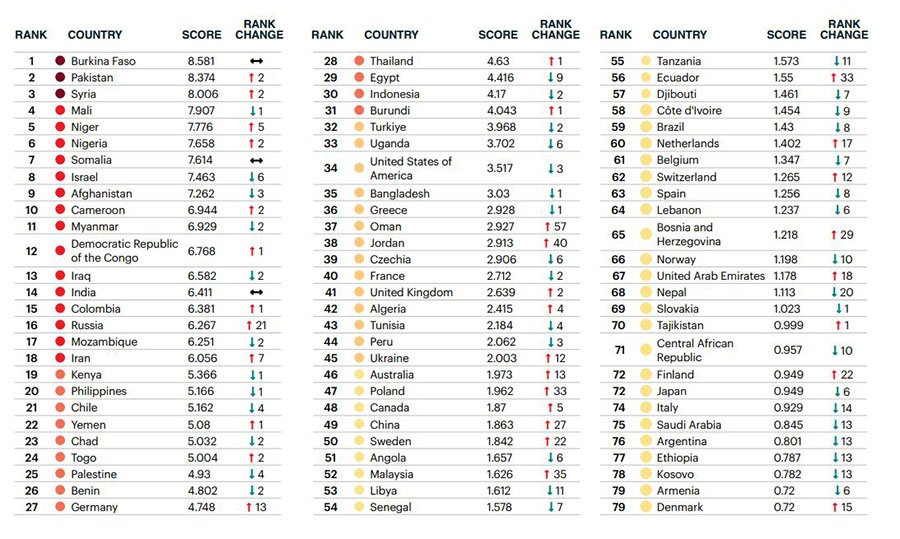 В лидерах негативного рейтинга остаётся Буркина-Фасо: несмотря на некоторое снижение показателей, страна по-прежнему отвечает почти за пятую часть всех террористических смертей в мире. Существенный рост смертности зафиксирован в Нигере и Пакистане — на 94% и 45% соответственно, что подчёркивает нестабильность позитивных сдвигов.