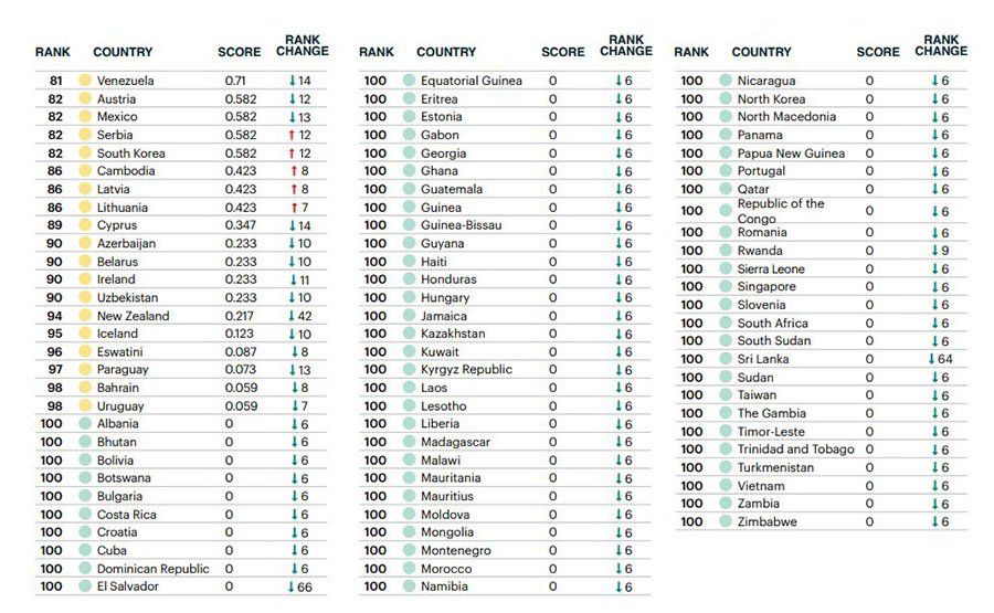 Более низкие показатели у Финляндии, Японии, Италии и Аргентины, однако они остаются в этой же категории, как и Армения, Дания и Кипр. На 90-м месте находятся Азербайджан и Беларусь, на 94-м — Новая Зеландия. Замыкают эту группу Эсватини, Парагвай и Уругвай.