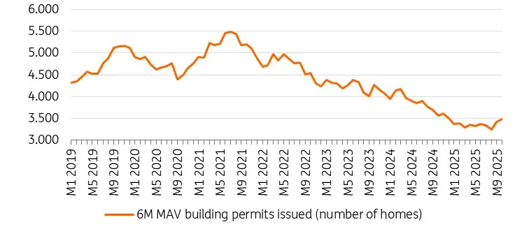 Количество выданных разрешений на строительство, которое сокращалось на протяжении нескольких лет, по всей видимости достигло минимального уровня в 2025 году. Данные Statbel показывают, что шестимесячная скользящая средняя начала выравниваться, что может свидетельствовать о прохождении нижней точки цикла.