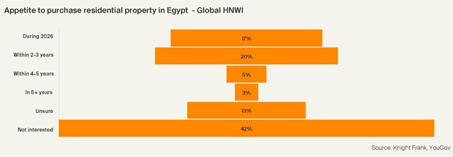 Опрос показал, что 17% инвесторов планируют приобрести жилье в Египте уже в 2026 году, а 20% – в течение ближайших двух-трех лет. Небольшая часть рассматривает более длительную перспективу: 5% – в горизонте четырех-пяти лет и еще 3% – после этого периода. При этом 13% участников пока не определились с планами, а 42% не проявляют интереса к покупкам.