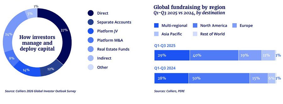 Colliers опубликовала отчёт «Global Investor Outlook 2026» с новыми данными о движении капитала на мировом рынке недвижимости. Аналитики отмечают резкий подъём сегмента дата-центров, который получил 31% глобального фандрайзинг, и первые признаки восстановления офисов. Одновременно сместились региональные потоки инвестиций: Европа и Азиатско-Тихоокеанский регион увеличили доли, а США уменьшили присутствие.