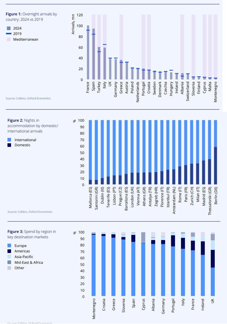 Темпы восстановления в странах различаются, но большинство направлений уже вышли на допандемийные уровни. Испания, Турция, Кипр, Мальта, Словения и Черногория полностью восстановили объёмы прибытий. Албания стала главным исключением: в 2024 году турпоток превысил уровень 2019-го на 80%, что подтверждает быстрое развитие рынка с низкой базы. Испания и Италия входят в число стран с самым высоким уровнем повторных приездов, тогда как Греция, Хорватия и Португалия чаще становятся первыми направлениями для новых туристов. По расходам лидирует Испания, за ней следуют Франция, Италия и Турция.