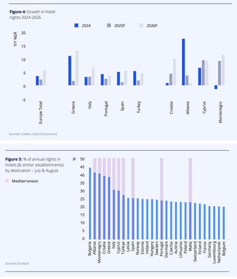 По прогнозам, в 2025 году рост гостиничных ночей в Средиземноморье будет умеренным — около 2% относительно 2024-го, что сопоставимо со среднеевропейским уровнем. В 2026-м ожидается ускорение до 6,4%, что выше прогноза для Европы в целом (5,6%). Наиболее сильный прирост прогнозируется для Греции, Хорватии и Черногории. Албания после нескольких лет стремительного роста перейдёт к более ровной траектории.