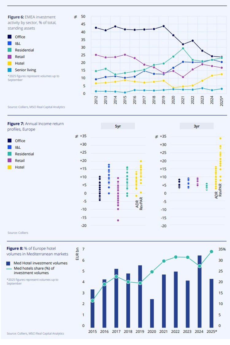 Основные инвестиционные потоки по-прежнему направлены в крупные западноевропейские страны, а также в Испанию и Италию. Дополнительно фиксируется усиление активности в Греции, где объём сделок растёт второй год подряд. Более мелкие развивающиеся направления привлекают значительно меньше капитала. При этом доля средиземноморских стран в структуре европейских гостиничных инвестиций увеличилась: с 19% в 2015–2019 годах до 28% в 2020–2024 годах, а к сентябрю 2025 года достигла почти 33%. Среди крупнейших сделок — продажа курорта Mare Nostrum Resort Tenerife за €430 млн.