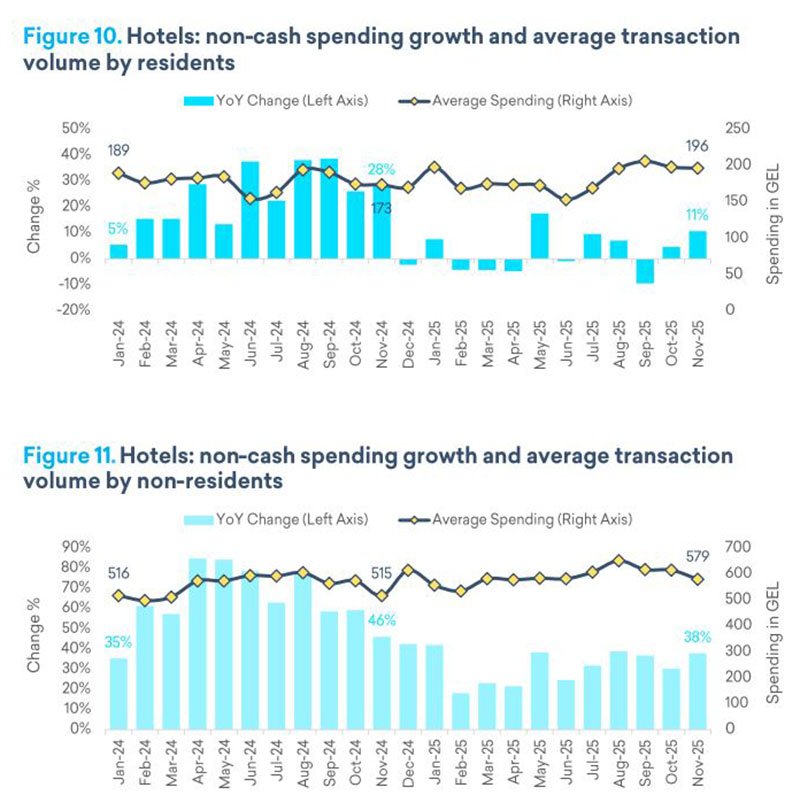 В гостиничном секторе совокупный объём безналичных платежей увеличился на 32% при размере одной операции 425 лари. Основная часть оборота в ноябре 2025 года пришлась на нерезидентов — 81%, при этом сумма одной транзакции у этой группы достигала ₾579. Платежи местных жителей выросли на 11% при чеке ₾196.