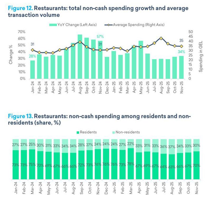 В ресторанном сегменте безналичные расходы увеличились на 34%. Размер одной операции составил 35 лари. Основной объём платежей обеспечили резиденты — 70% оборота. Их расходы выросли на 24% по сравнению с аналогичным периодом прошлого года, при чеке ₾26. Со стороны нерезидентов рост оказался более выраженным — 66%, а сумма одной транзакции достигла 136 лари, что примерно в пять раз превышает показатель резидентов.