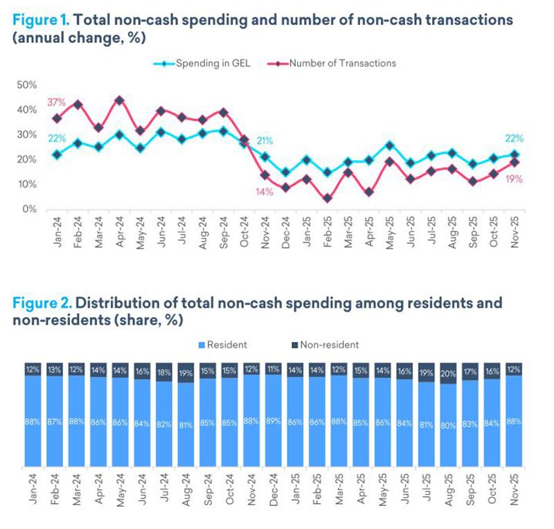 В отчёте Consumer Spending Tracker сообщается, что общий объём безналичных расходов через каналы TBC Bank увеличился на 22% в годовом выражении, а количество транзакций — на 19%. Основная часть операций в ноябре пришлась на резидентов — 88%. При этом в ряде сегментов фиксировалась повышенная активность иностранцев.