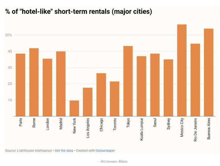 В Мехико доля таких объектов достигает 57%, что делает рынок особенно чувствительным для гостиничного бизнеса. В Нью-Йорке, напротив, из-за жёсткого регулирования количество подобных апартаментов заметно сократилось, и давление на отели снизилось.