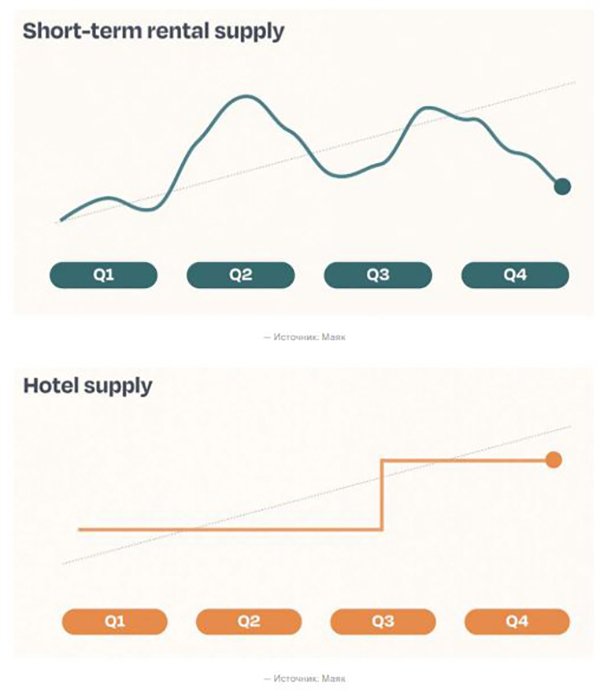 Это означает, что апартаменты выходят на рынок преимущественно в периоды максимального спроса и так же быстро исчезают, тогда как отели продолжают работать в стабильном режиме независимо от сезона.