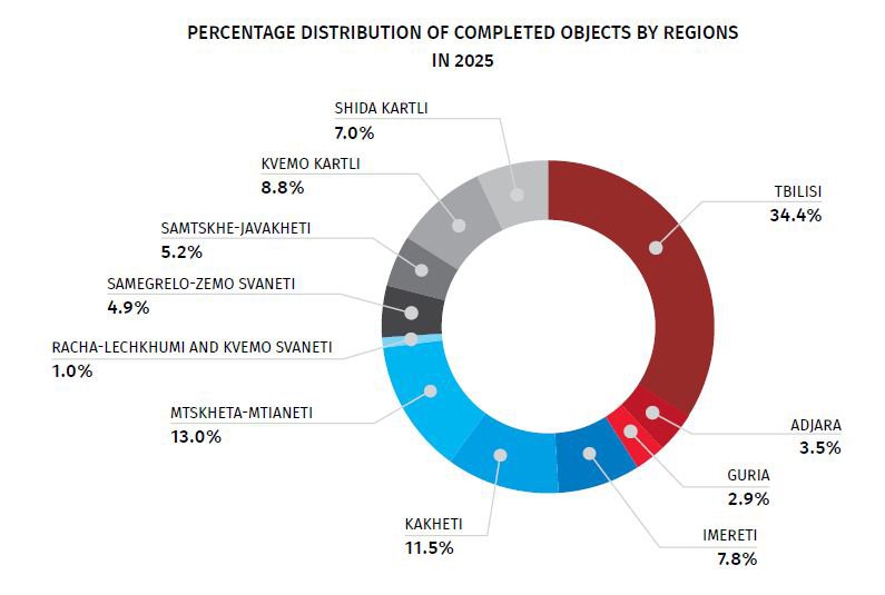 В эксплуатацию введены 3 393 объекта — на 5,9% меньше, чем в 2024 году. При этом их совокупная площадь составила 3,5 млн кв. м, увеличившись на 8,1%. Наибольшая доля построенной недвижимости зафиксирована в Тбилиси — 34,4%. Существенные показатели также отмечены в Мцхета–Мтианети (13,0%), Кахетии (11,5%) и Квемо-Картли (8,8%).