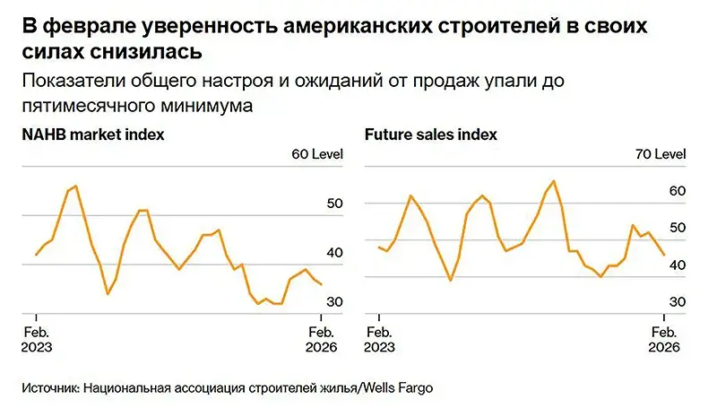 Уверенность американских застройщиков в феврале вновь сократилась. Индекс рыночных условий, рассчитываемый Национальной ассоциацией домостроителей (NAHB) совместно с Wells Fargo, упал до 36 пунктов — минимального уровня с сентября 2025 года, сообщает Bloomberg. Показатель остаётся ниже отметки 50, что означает преобладание негативных оценок в отрасли.