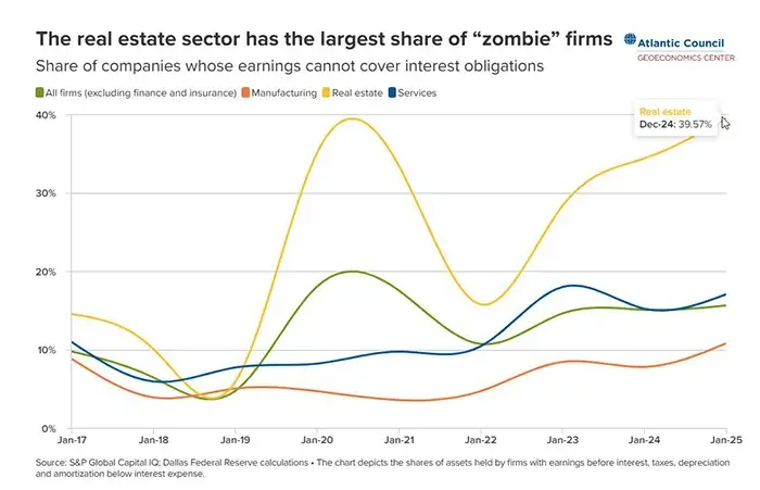 Ключевые риски концентрируются в финансовой системе. Исследование Федерального резервного банка Далласа показывает, что в 2024 году около 40% кредитов в секторе недвижимости приходилось на компании, чья операционная прибыль не покрывает процентные обязательства. В 2018 году этот показатель составлял 6%.