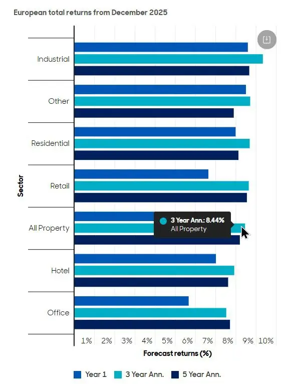 По состоянию на сентябрь 2025 года совокупная доходность европейской недвижимости составила 6,5%. В 2026 году ожидается рост до 7,1%. Среднегодовая доходность на горизонте трех и пяти лет прогнозируется на уровне 8,4% и 8,2% соответственно.