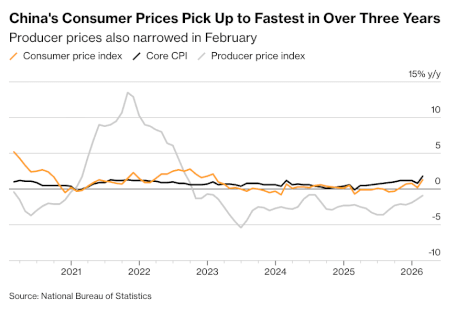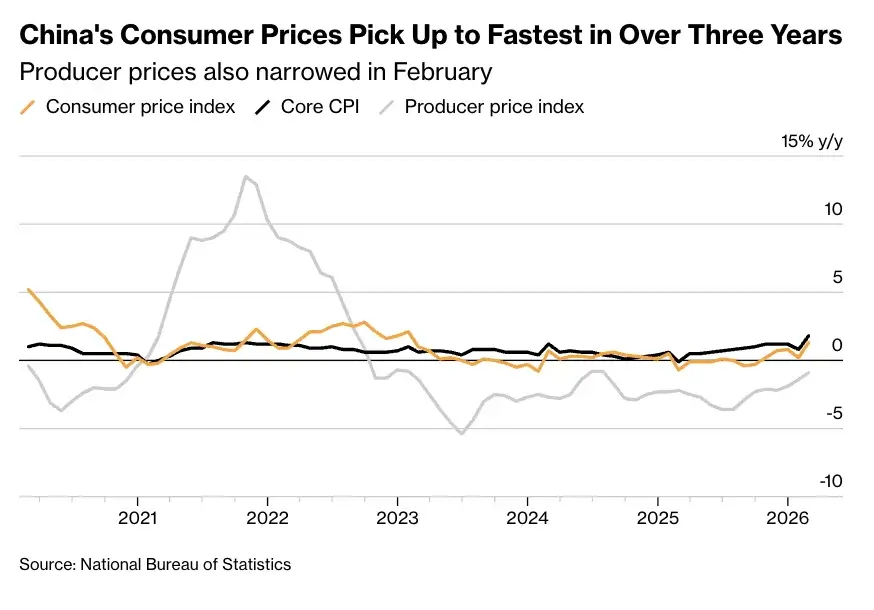 Инфляция в Китае ускорилась до самого высокого уровня более чем за три года, поскольку праздничные расходы населения во время Лунного Нового года и рост цен на энергоносители усилили давление на потребительские цены. По данным Государственного статистического управления Китая, индекс потребительских цен в феврале вырос на 1,3% по сравнению с аналогичным периодом прошлого года.