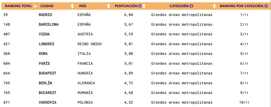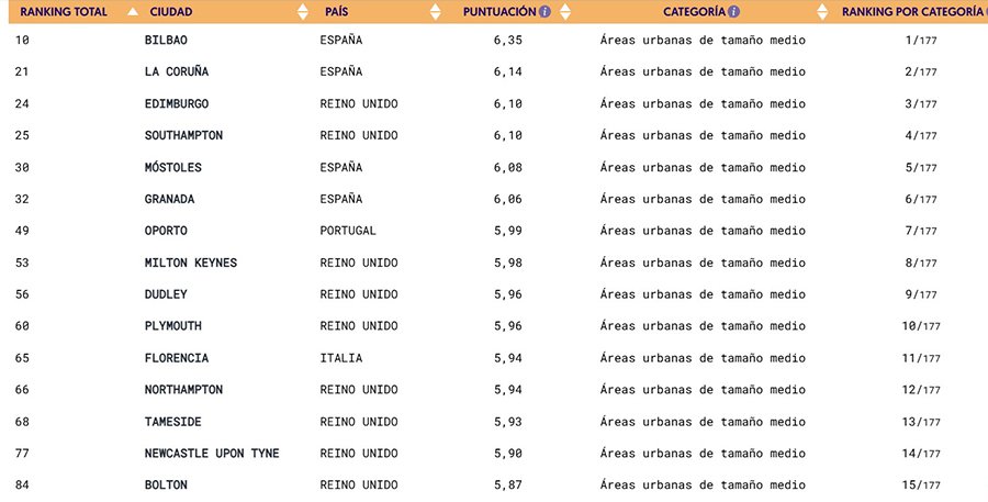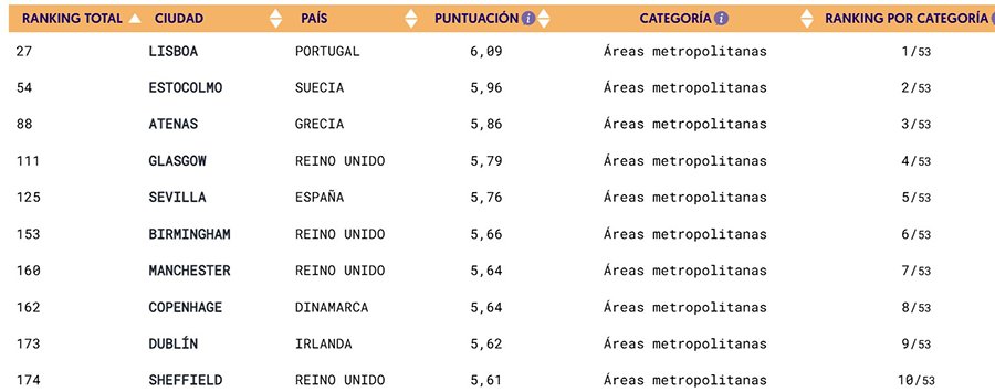Glasgow (5.79) climbed to fourth thanks to major brownfield-renovation projects and better access to green districts. Seville (5.76) completes the top five — a city where walking routes and cycling infrastructure have become part of its identity.
