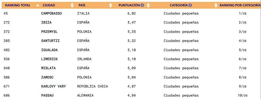 In the category of very small municipalities (under 50,000 residents), Campobasso (6.02) leads — a regional center in southern Italy proving that even small towns can be comfortable. Second is Ibiza (5.47), where natural potential and climate offset high seasonal pressure. Despite its tourism profile, the town maintains compactness and park access.