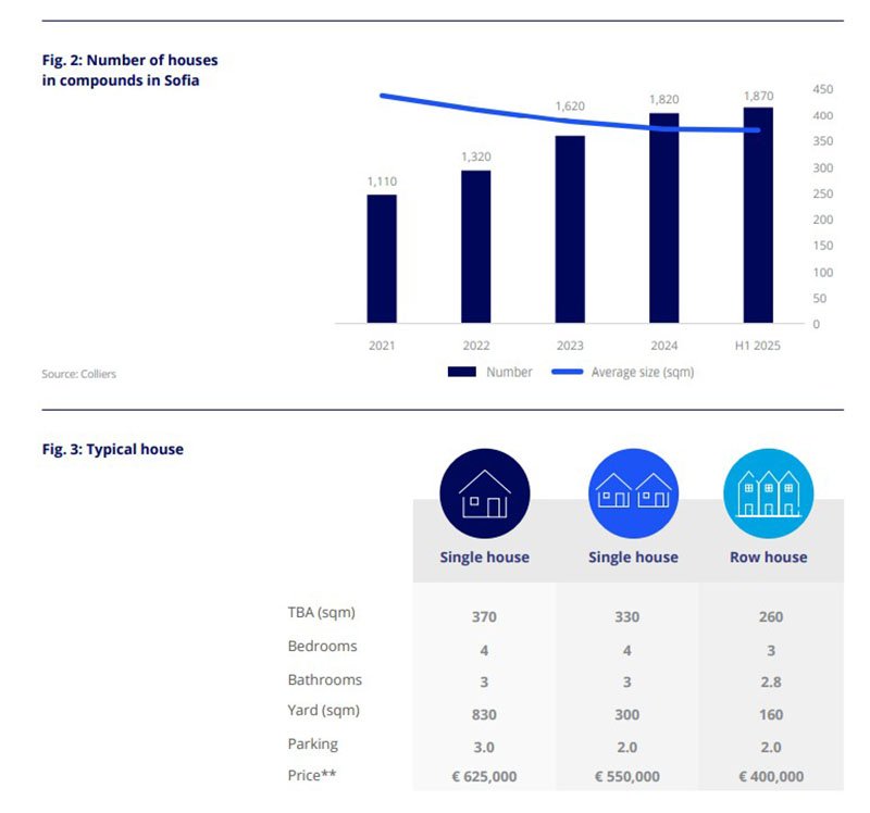 Household spending on housing in Bulgaria in 2023 amounted to 10.6% of GDP, below the EU average, indicating continued development potential for the segment. By mid-2025, Sofia had 1,870 houses grouped into 118 residential projects. Supply increased, while the trend toward smaller average unit sizes persisted. Detached houses remained the most common format, followed by townhouses with small plots.