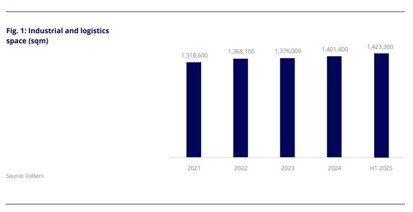 By mid-2025, the volume of Class A and B warehouse and logistics space in Sofia reached 1.42 million sq. m, increasing by 21.9 thousand sq. m compared to the end of 2024. The sector ranked second with a 28% share. New supply remained limited, while 157.3 thousand sq. m were under active construction.