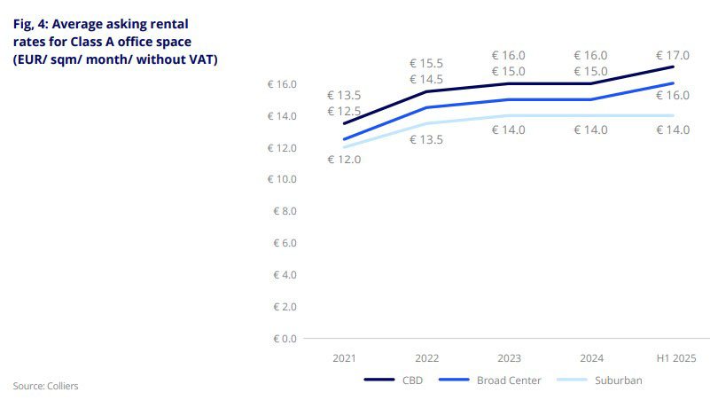 Leasing activity declined, yet vacancy remained at a record low of 2.1%. Rental rates were largely unchanged: €5.5 per sq. m per month for Class A properties and €4 for Class B. Operating costs ranged between €0.8–1.5 per sq. m per month.