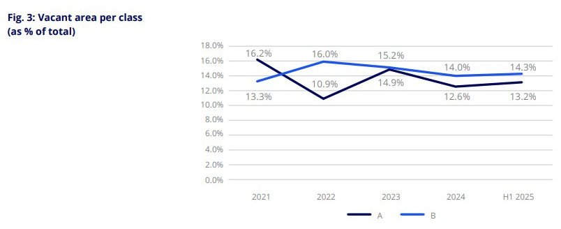 Net absorption increased from 32.5 thousand to 39.3 thousand sq. m. The bulk of this growth was driven by lease renewals and tenant relocations to higher-quality premises. Vacancy rates in Class A offices rose from 12.6% to 13.2%, and in Class B from 14.0% to 14.3%. The IT sector remained the key demand driver, followed by financial and professional services.