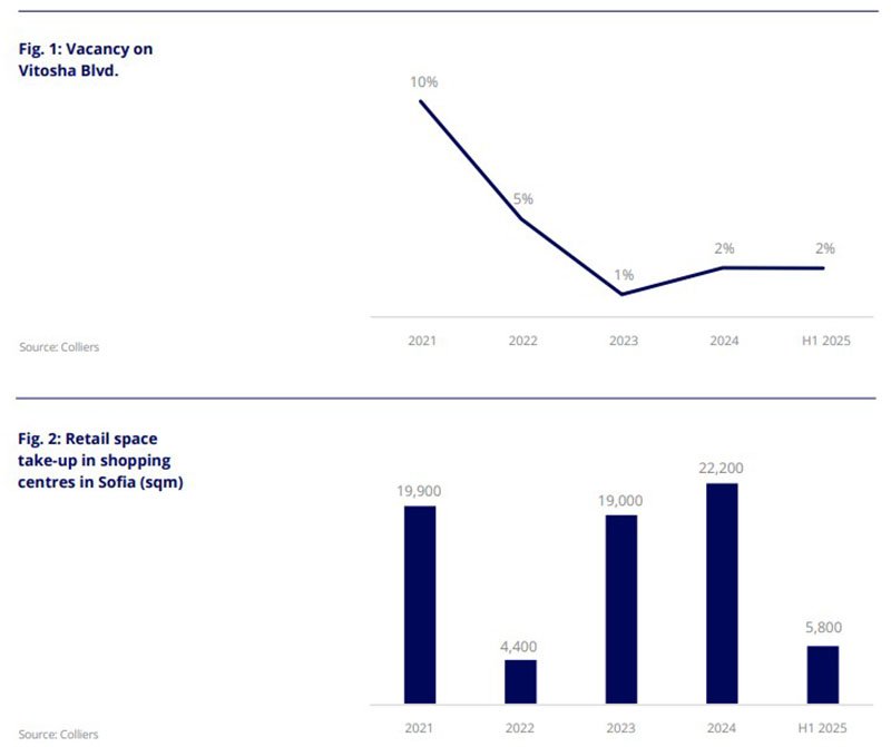 Leasing activity in the segment remained high. Vacancy on Vitosha Boulevard held at 2%, retail parks were almost fully occupied, and average vacancy in shopping centres stood at 3.2%. The volume of new lease deals in shopping centres reached 5.8 thousand sq. m, excluding internal tenant relocations within projects.