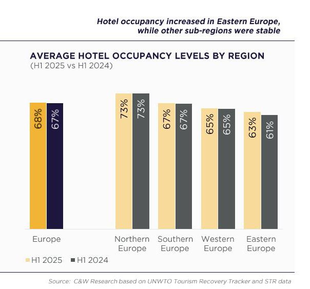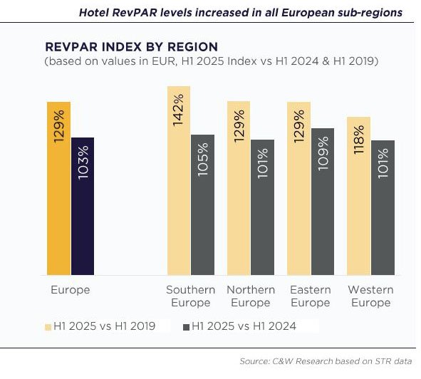 At the regional level, RevPAR growth was broad-based. Across Europe, the RevPAR index reached 129% compared with H1 2019 and 103% versus 2024. Southern Europe recorded the strongest outperformance of pre-pandemic levels, with the index at 142% versus 2019 and 105% year on year. Northern and Eastern Europe also reached 129% relative to 2019, with annual growth of 101% and 109% respectively. Western Europe showed more restrained dynamics, at 118% versus 2019 and 101% compared with H1 2024.
