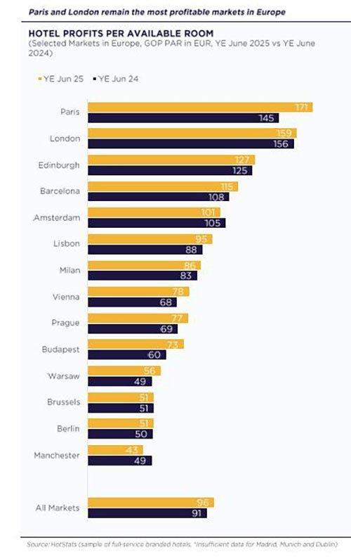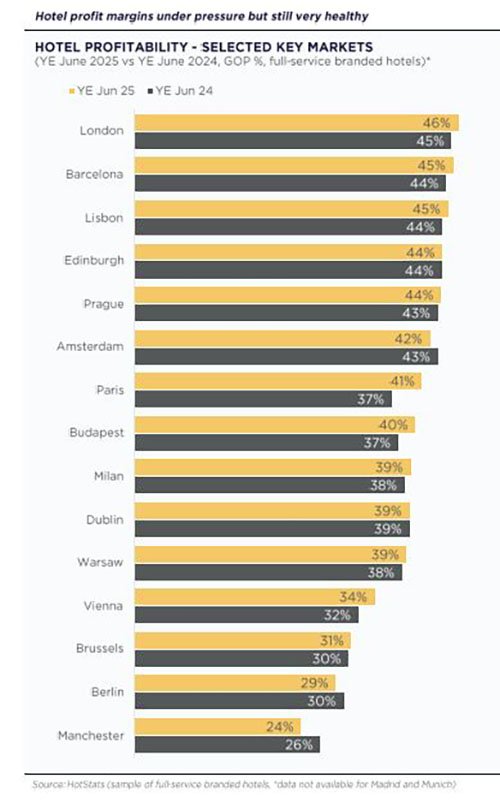 Amsterdam faced moderate pressure, with a margin of around 42% and GOP PAR of €105, as rising costs coincided with softer revenue performance. More pronounced deterioration was recorded in Berlin and Manchester. In Berlin, the margin fell to 29% with GOP PAR at around €51, while in Manchester margins declined to 24% and GOP PAR to €43 amid falling revenues and rising costs.
