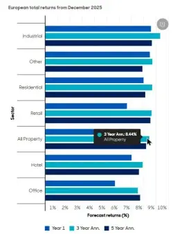 Total property returns stood at 6.5% as of September 2025. Returns are projected to rise to 7.1% over the next year, with three- and five-year annualised forecasts at 8.4% and 8.2%, respectively. Income growth is expected to be the primary driver of near-term performance.
