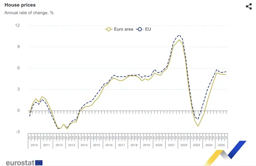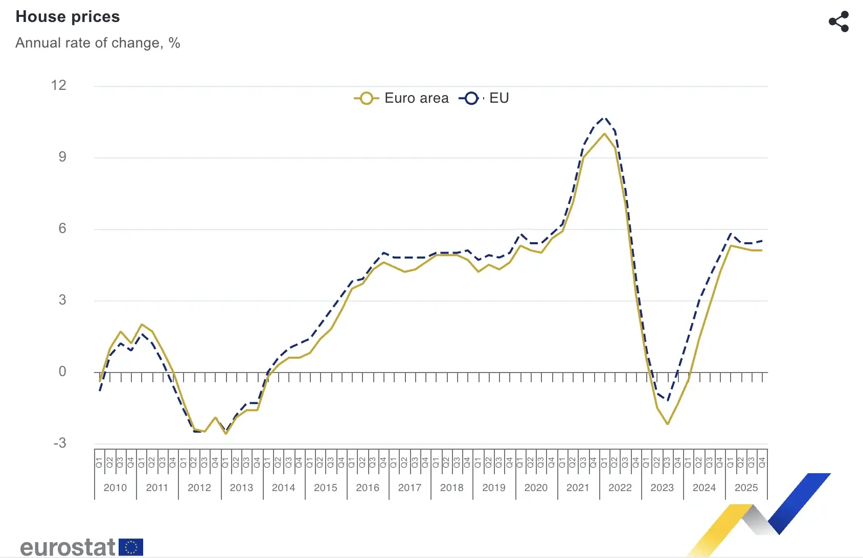 The release shows that Europe’s housing market remained on an upward path at the end of 2025 after already posting strong gains in the previous quarter. In the third quarter of 2025, annual house-price growth had stood at 5.1% in the euro area and 5.4% in the EU, meaning the year-end reading showed a further modest acceleration at the broader EU level.