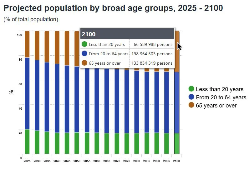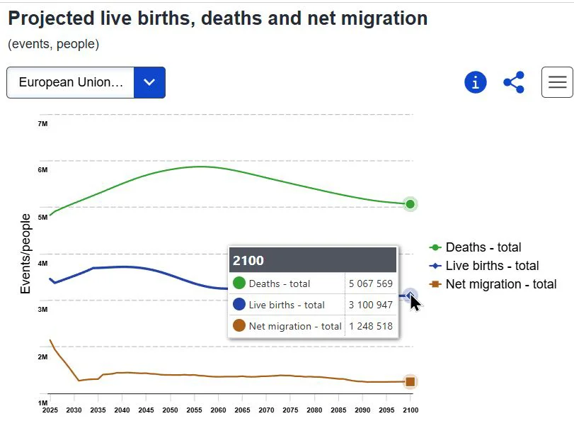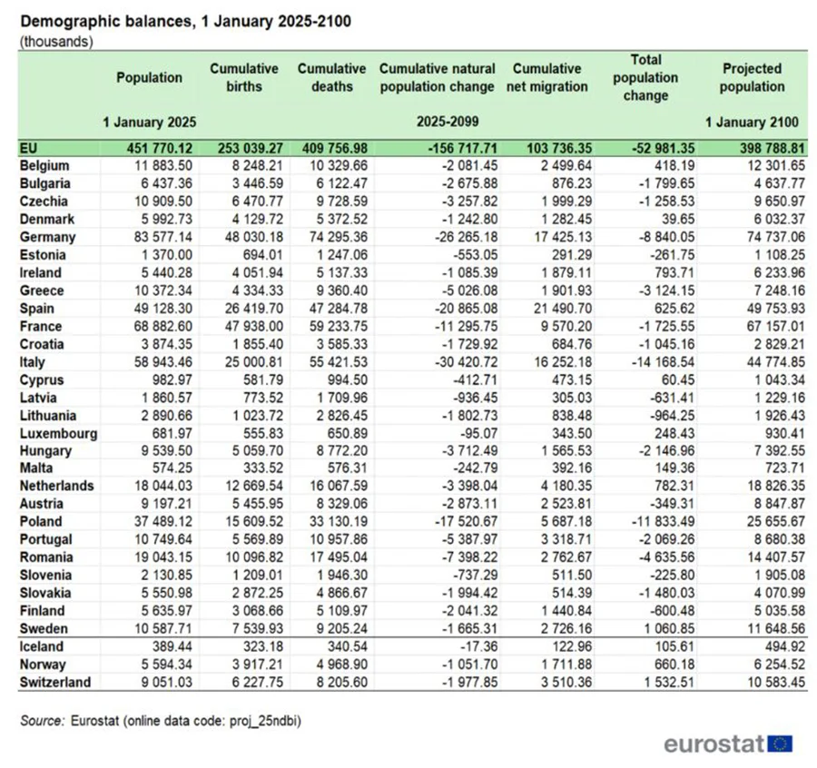 Migration partially offsets this decline. According to Eurostat estimates, net migration into the EU over the same period will total around 103.7 million people. However, this is not enough to compensate for natural decrease. The overall balance remains negative — a loss of 53 million people by 2100.