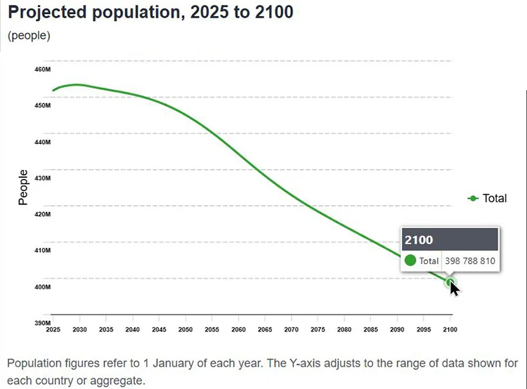 Germany will remain the most populous EU country, although its population is projected to fall from 83.6 million in 2025 to 74.7 million by 2100. France will also retain a strong position, with a slight decrease from 68.8 million to 67.2 million.