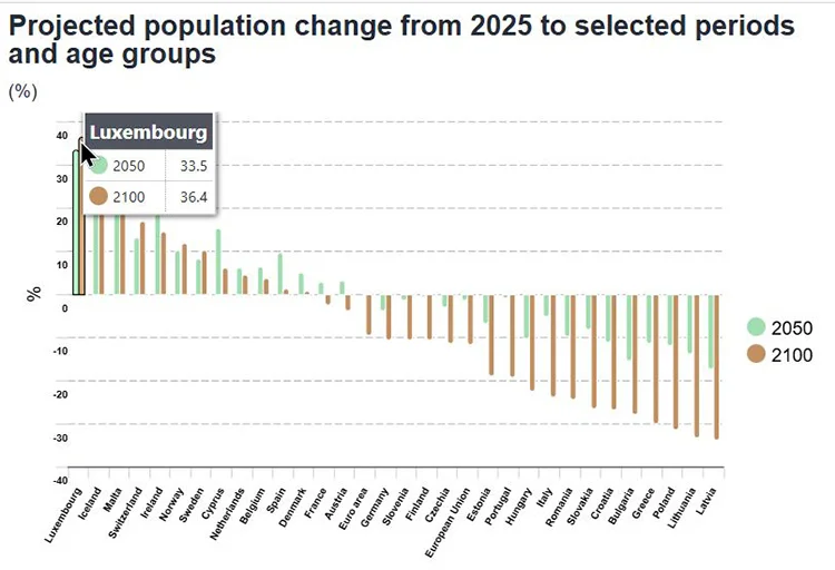 Growth is expected in nine EU countries and all three European Free Trade Association states. Luxembourg is projected to grow by 36.4%, Malta by 26%. Ireland and Sweden are expected to see increases between +10% and +20%. Spain’s population is forecast to rise from 49.1 million in 2025 to 49.8 million in 2100.