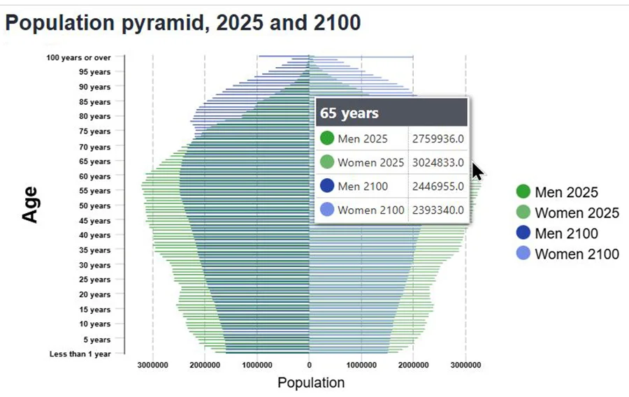 In 2025, there are roughly three working-age people per one person aged 65+, but by the end of the century this ratio may shrink to 2:3.