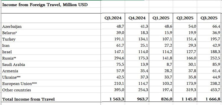 Azerbaijan closed the top five, showing the fastest growth: +36.3% in Q3 to $66.4 million, and +32.4% over nine months to $157.9 million. Tourist arrivals surged 34.9% to 220,200, with average spending of $720 — higher than most neighboring countries.