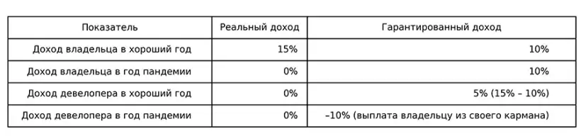 А что происходит, если владелец номера выбирает опцию «Гарантированный доход»? Например, на уровне 10% годовых. В таком случае в хороший год девелопер, который гарантирует этот доход владельцу номера, зарабатывает 15%, из которых 10% отдает владельцу номера. 5% остаются у девелопера. Но вот наступает пандемия. Отель не принес доход. В таком случае девелопер все равно выплачивает 10% гарантированного дохода владельцу номера из своего кармана.