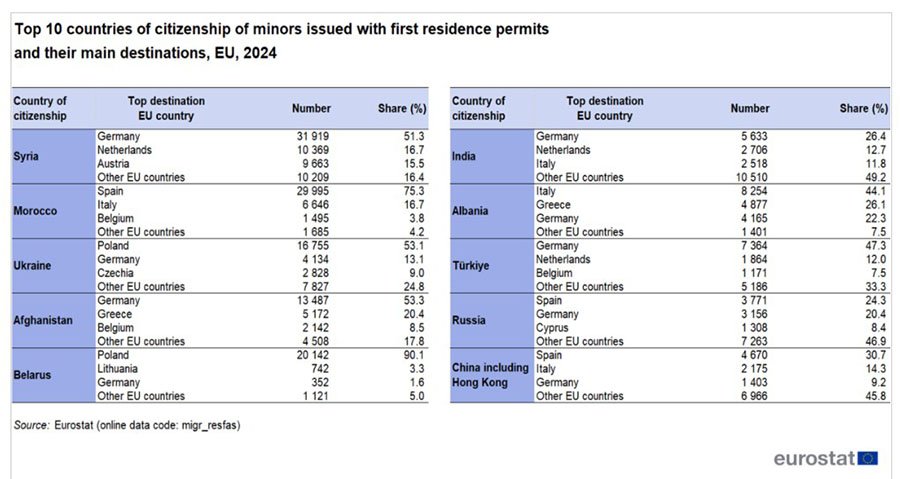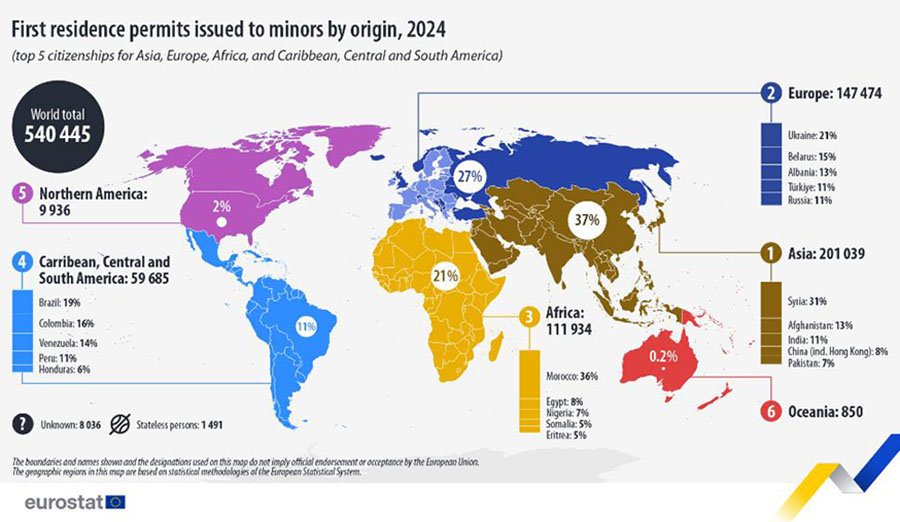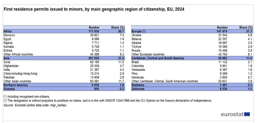 Наибольшая доля несовершеннолетних с ВНЖ приходилась на Азию — 37,2%. В этой группе лидировала Сирия — 62 160 разрешений (11,5%). Далее следовали Афганистан — 25 309 (4,7%) и Индия — 21 367 (4,0%). Жители европейских государств вне ЕС составляли 27,3%. Здесь крупнейшими представителями были Украина — 31 544 (5,8%), Беларусь — 22 357 (4,1%) и Албания — 18 697 (3,5%).