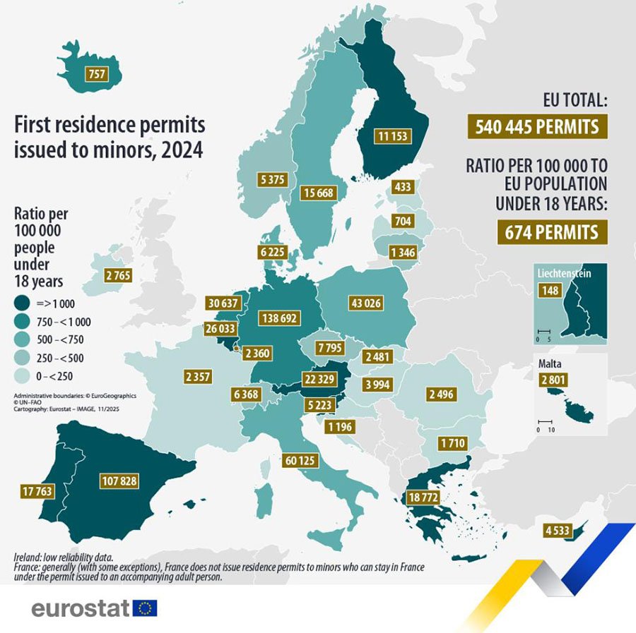 Больше всего детей получили ВНЖ в Германии — 138 692 (26% от общего объёма в ЕС). Далее следуют Испания — 107 828 (20%) и Италия — 60 125 (11%). В относительных показателях средний уровень составлял 674 разрешения на 100 000 несовершеннолетних. Лидировала Мальта — 3 379, далее следовали Кипр — 2 584 и Люксембург — 1 861. Австрия также вошла в группу стран с уровнем значительно выше среднего.