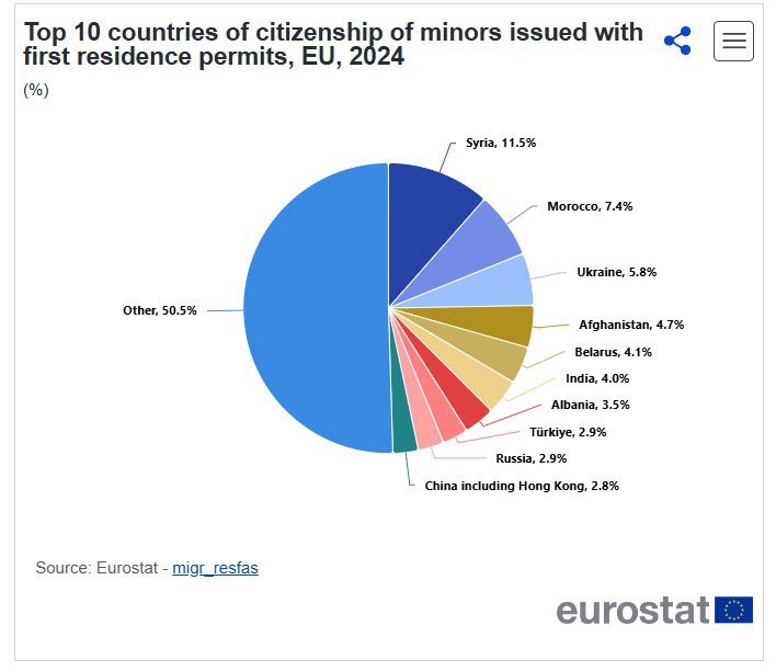 В 2024 году дети из третьих стран получили более 540 тысяч видов на жительство в ЕС, сообщает Eurostat. Лидировали семейные основания и воссоединение. Чаще всего несовершеннолетние приезжали из Сирии, Марокко и Украины. Россия тоже попала в статистику с долей в 2,9%, порядка 15 тысяч. Больше всего ВНЖ оформили Германия, Испания и Италия. В пересчёте на 100 000 человек лидировал Кипр.
