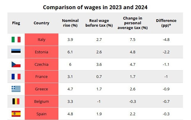 В 2024 году налоги и социальные отчисления выросли в среднем на 1,6 п.п. в странах ЕС, а реальные заработки – лишь на 1,3%. Особенно заметный дисбаланс наблюдался в Италии, Эстонии, Чехии, Франции, Греции, Бельгии и Испании. В этих экономиках повышение ставок и пересмотр льготных режимов привели к тому, что рост зарплат не компенсировал рост обязательных платежей. Чистый доход работников без детей в среднем сократился в этих странах на 1-2%.