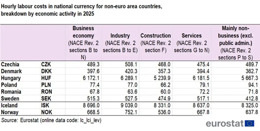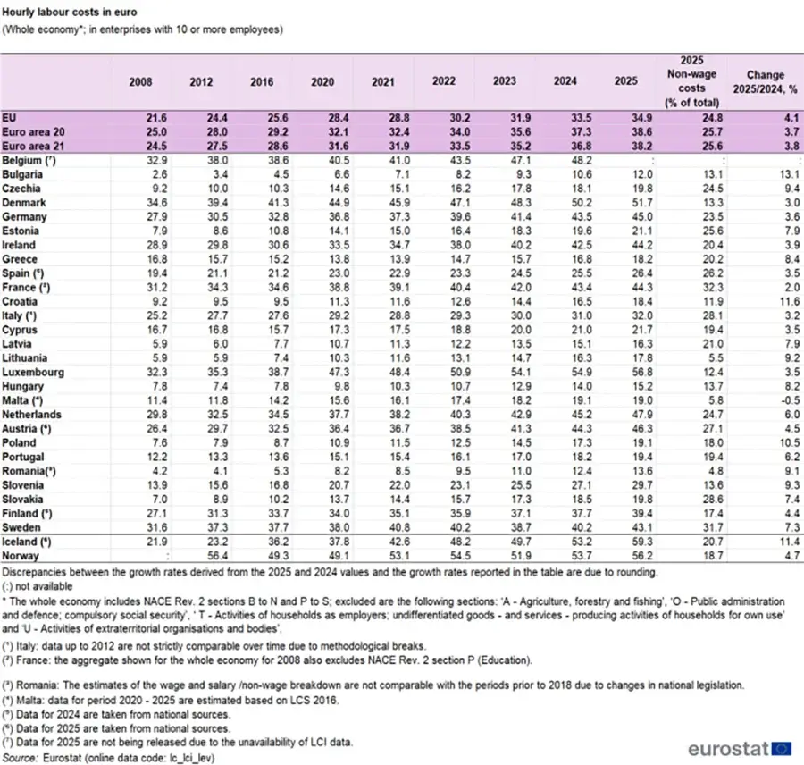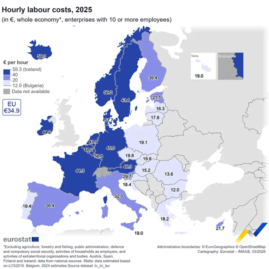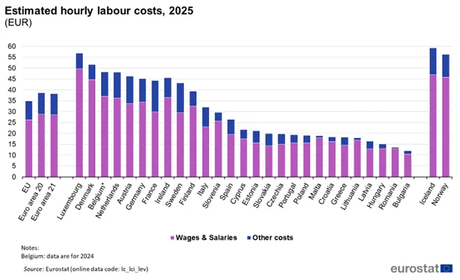 В странах ЕС по-прежнему фиксируются значительные различия в средних почасовых затратах на рабочую силу. Они варьируются от 12 евро в Болгарии до 57 в Люксембурге. По выплатам на социальные взносы и пенсии лидируют Франция и Швеция. Eurostatзафиксировал рост зарплат по итогам 2025 года почти во всех государствах, кроме Мальты.