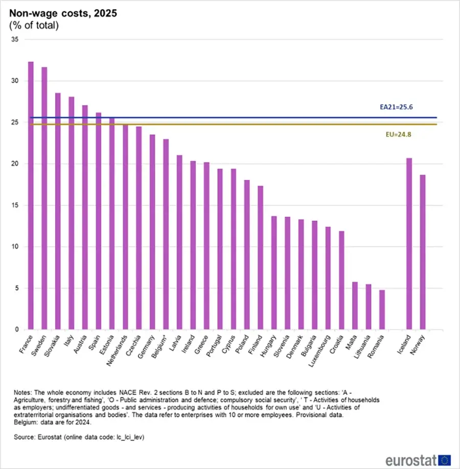 Самая низкая доля расходов, не связанных с заработной платой, в ЕС была зафиксирована в Румынии (4,8 %), Литве (5,5 %) и на Мальте (5,8 %), а самая высокая — во Франции (32,3%), Швеции (31,7 %) и Словакии (28,6 %).