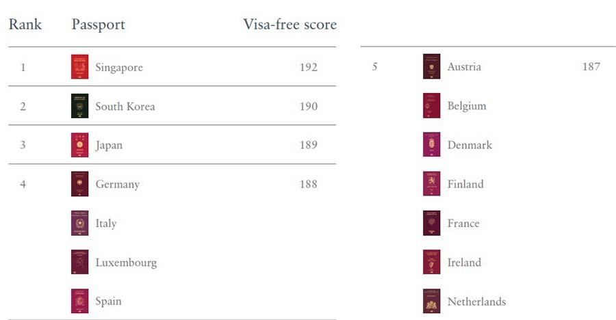 Лидером рейтинга вновь стал Сингапур, чей паспорт открывает двери в 193 страны. На втором месте оказались Япония и Южная Корея с доступом в 190 государств. Европа также сохраняет весомые позиции: семь стран ЕС – Дания, Финляндия, Франция, Германия, Ирландия, Италия и Испания – занимают третью строчку, 189 направлений. Четвертое место делят Австрия, Бельгия, Люксембург, Нидерланды, Норвегия, Португалия и Швеция (188). В пятерке лидеров также Новая Зеландия, она разделила позицию с Грецией и Швейцарией.