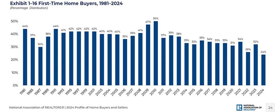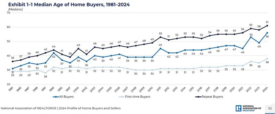 По данным Национальной ассоциации риэлторов, в 2024 году доля покупающих жилье впервые сократилась до 24% – это минимальное значение с начала наблюдений в 1981 году. Средний возраст первого покупателя достиг 38 лет, заключающего повторную сделку – 61 года, что тоже стало рекордом.