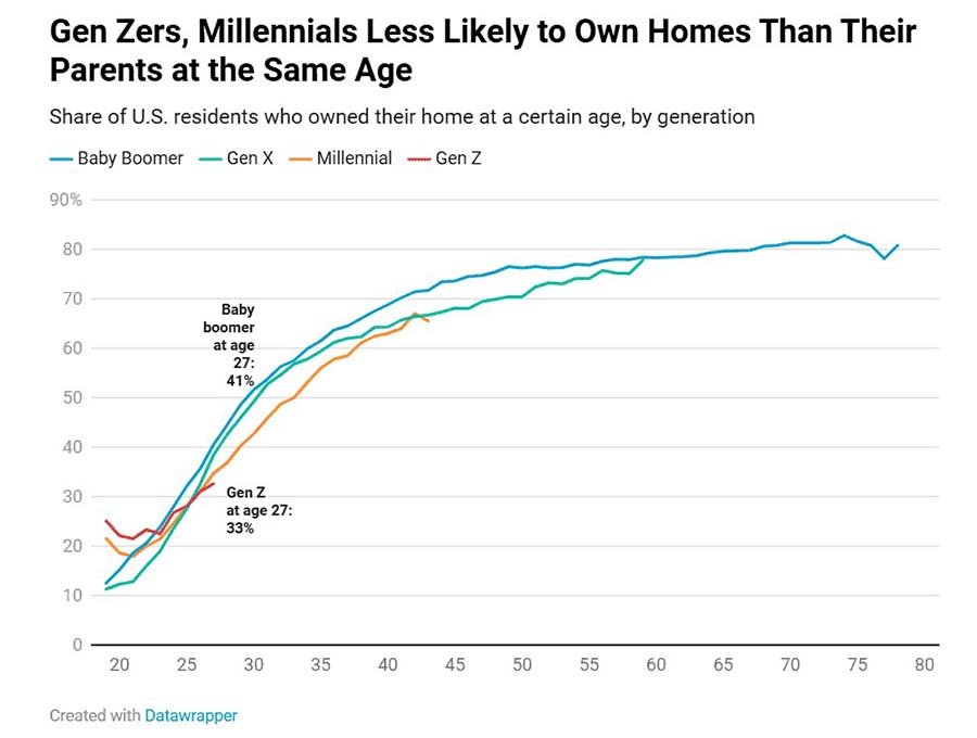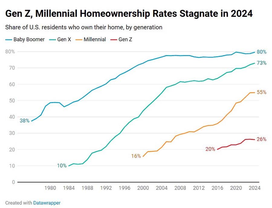 Контраст особенно заметен при сравнении ровесников разных эпох. Среди 27-летних зуммеров в 2024 году жильем владели 32,6%. У поколения X в том же возрасте показатель составлял 38,4%, у бэби-бумеров – 40,5%. Среди 35-летних миллениалов уровень домовладения в 2024 году равнялся 56%, у поколения X в этом возрасте – 59,4%, у бэби-бумеров – 61,5%.