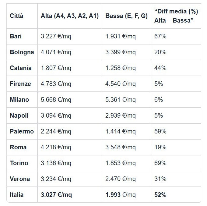 В среднем по Италии жилье класса A и выше стоит около €3 000 за кв. м, объекты категорий E–G оцениваются менее чем в €2 000. Объекты, возведенные с применением передовых технологий, в полтора раза дороже, чем обычная недвижимость. Разница в ценах наблюдается во всех регионах страны, хотя в отдельных городах разброс выражен сильнее. Самое заметное отличие, на 70%, зафиксировано в Турине, где энергоэффективное жилье стоит в среднем €3 136 за кв. м, а с низким классом – €1 853 за кв. м. На втором месте – Бари, где показатели варьируются от 3 227 до 1 931 соответственно (67%). Замыкает тройку Палермо – €2 244 и 1 414 (59%).