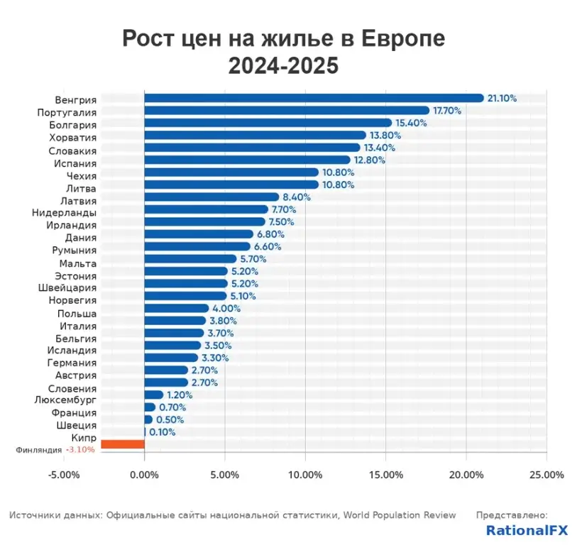 • Темпы годового роста цен (без учета инфляции) в 2025 г.: Венгрия (+21%), Португалия (+18%), Болгария (+15%)