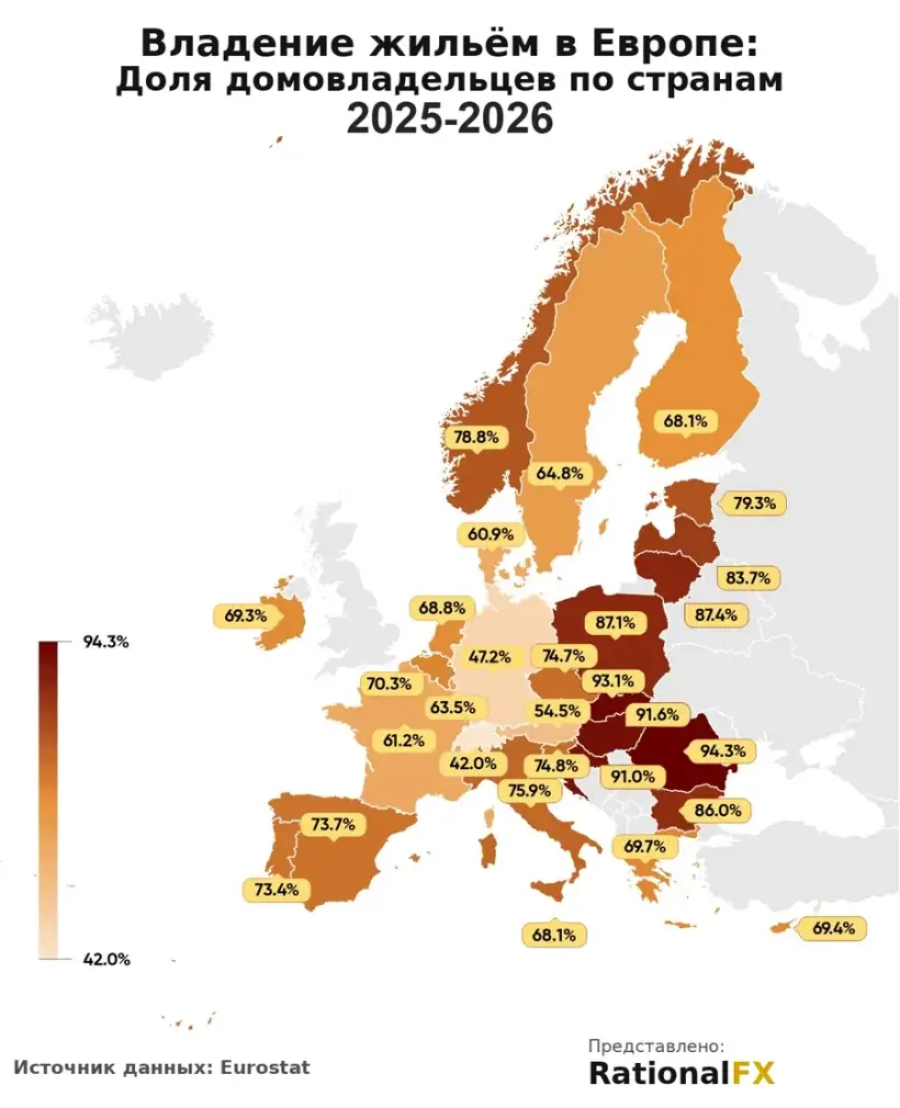 Самый высокий уровень домовладения – в Румынии (94,3%), Словакии (93,1%), Венгрии (91,6%) и Хорватии (91%). Это наследие постсоциалистической приватизации. Однако даже здесь доступность жилья в городских центрах стремительно снижается: ипотека дорожает, а молодые семьи всё чаще зависят от родительского капитала.