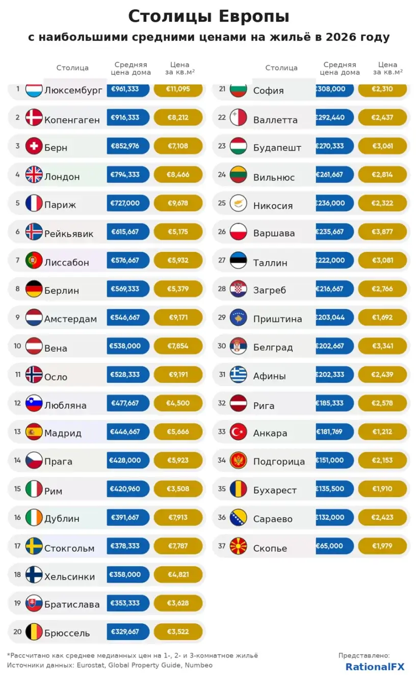 • Самые дорогие столицы: Люксембург (средняя стоимость единицы жилья – €961 333) и Копенгаген (€916 333)