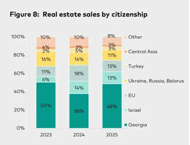 ЕС тоже продемонстрировал резкую динамику: доля европейцев выросла с 11% в 2023 году до 18% в 2024-м, но в 2025 году опять снизилась до 13%. Такой «качельный» тренд может быть связан как с разовыми крупными сделками, так и с изменением оценки жилой недвижимости Батуми.
