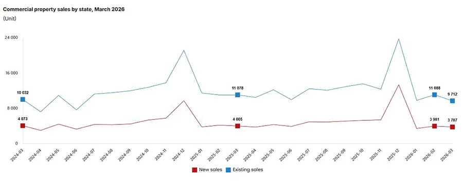 Сегмент коммерческой недвижимости в марте 2026 года также показал отрицательную динамику. Общее число сделок снизилось до 13 499 (–10,5%). Продажи новых коммерческих объектов сократились на 5,4% (до 3 787). Вторичный сегмент просел сильнее — до 9 712 сделок (–12,3%).